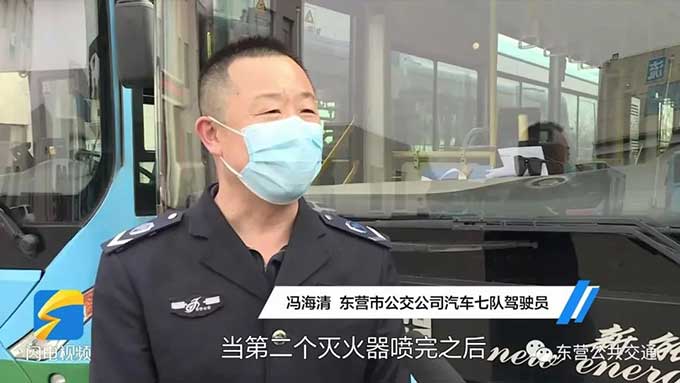 恰巧在這個(gè)時(shí)候,東營市公交公司公交車駕駛員馮海清駕駛178路公交車行駛至東營市一中站點(diǎn)附近,于是帶著車上的滅火器趕緊上前施救。然而噴完一罐滅火器后,煙依然很大,馮海清便趕忙回到車廂拿了兩罐,當(dāng)?shù)诙€(gè)滅火器噴完之后,火勢得到有效控制,最終在噴完第三罐滅火器后,徹底把火撲滅了。