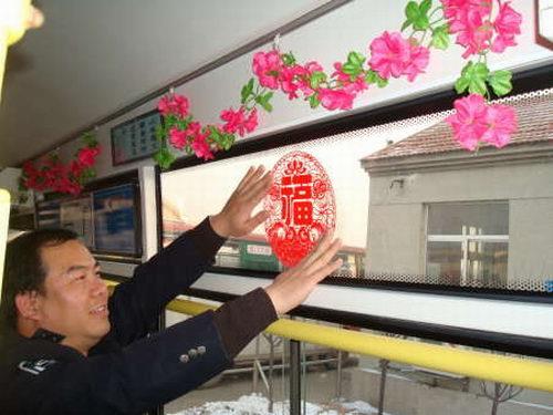 元月11日春運第一天,公交公司8路車組工作人員忙著將自費購買的彩色拉花、剪紙等飾品,張貼、懸掛在車廂內,積極營造出春運溫馨和諧的喜慶氣氛,與乘客一起喜迎春節(jié)的到來。