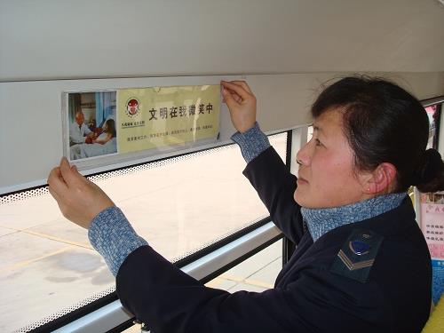 12月11日,市公交公司汽車七隊(duì)8路車組的工作人員把“從我做起,走向文明”的宣傳條幅安裝在車廂,增強(qiáng)公交文明教育對(duì)社會(huì)的示范性和輻射性。