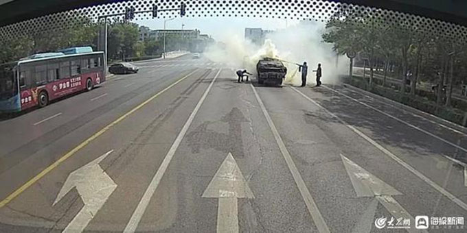 9月10日13點03分,東營公交通勤車隊駕駛員王維明像往常一樣執(zhí)行124路公交車運(yùn)營任務(wù),當(dāng)他駕車行駛到沂州路與瀏陽河路交叉口紅綠燈時,發(fā)現(xiàn)了異常情況——前方一輛貨車起火了,王師傅沒有絲毫畏懼,立即停車開門,提起車載滅火器沖下了車。